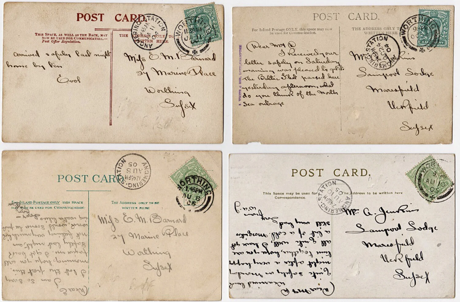 These four cards from the early 1900s feature the Angmering Station postmark. They were all sent by a William Arthur Jenkins to just two addressees - his parents, and a Miss Edith M. Barnard.