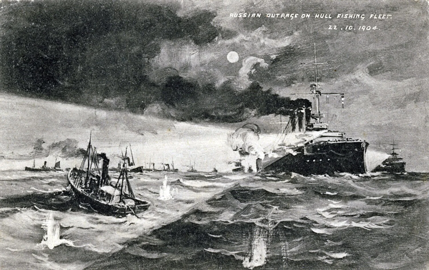 Many postcards were issued depicting what came to be called the Dogger Bank Incident. The one featured here is an artist's impression of the action.