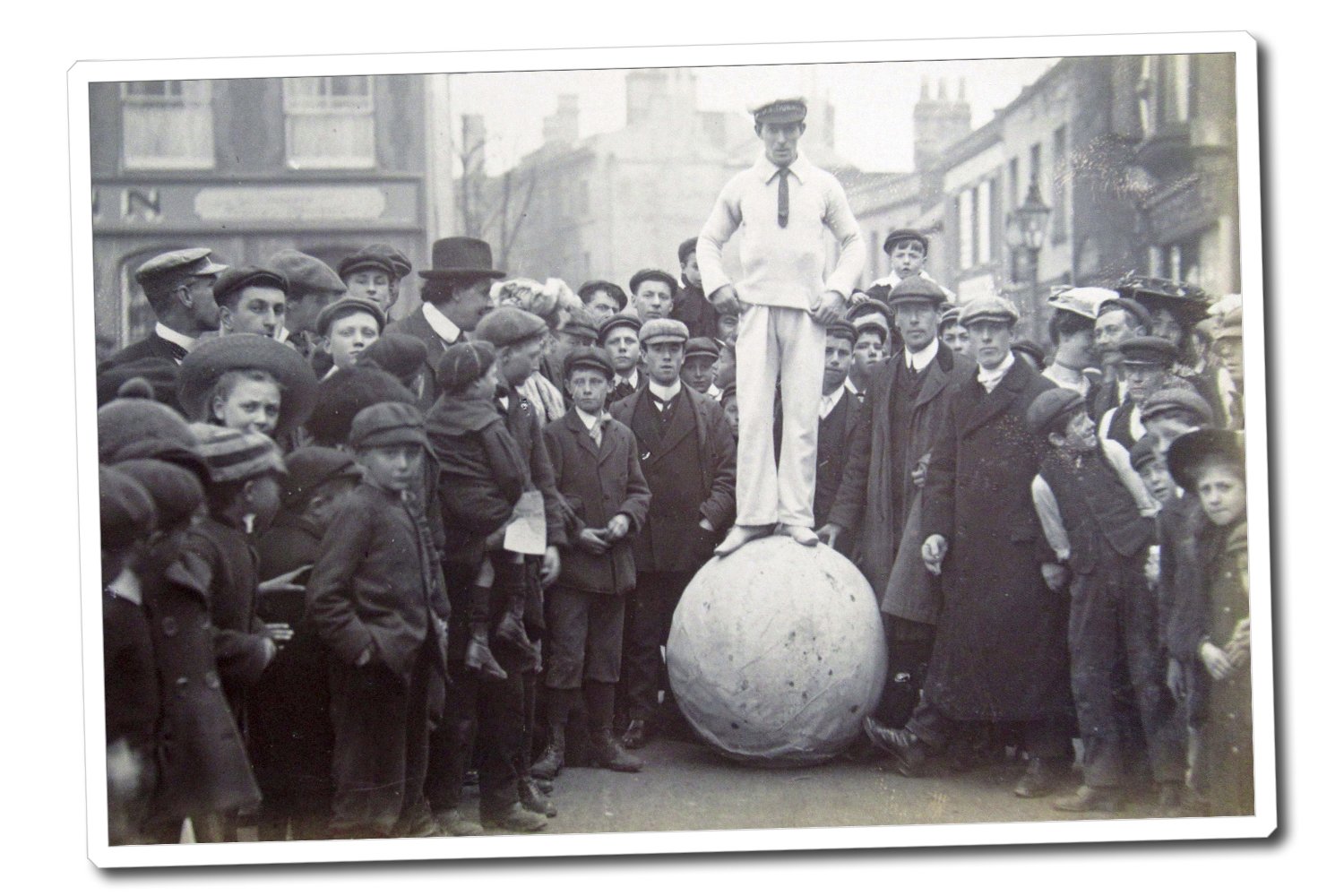 Ball walking, often for considerable distances, seems to have been a popular activity at this time and P.J. Durney was a well known exponent. Presumably money was collected from the onlookers, and maybe from local sponsors who might have gained from the influx of people to the town and its hostelries. The individual propping his foot against the ball to keep it stationary looks like he might be the promoter!