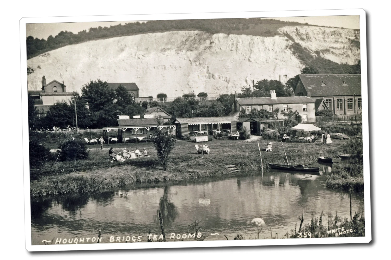 The number 359 on this card, published by J. White, suggests it possibly dates from the 1930s, and the visitors’ dress supports this. By then, wooden tea shacks had supplanted the remains of the chalk pit operations and the moorings were used for rowing boat hire. There was also a tea room on the other side of the bridge, which remains in that role today.