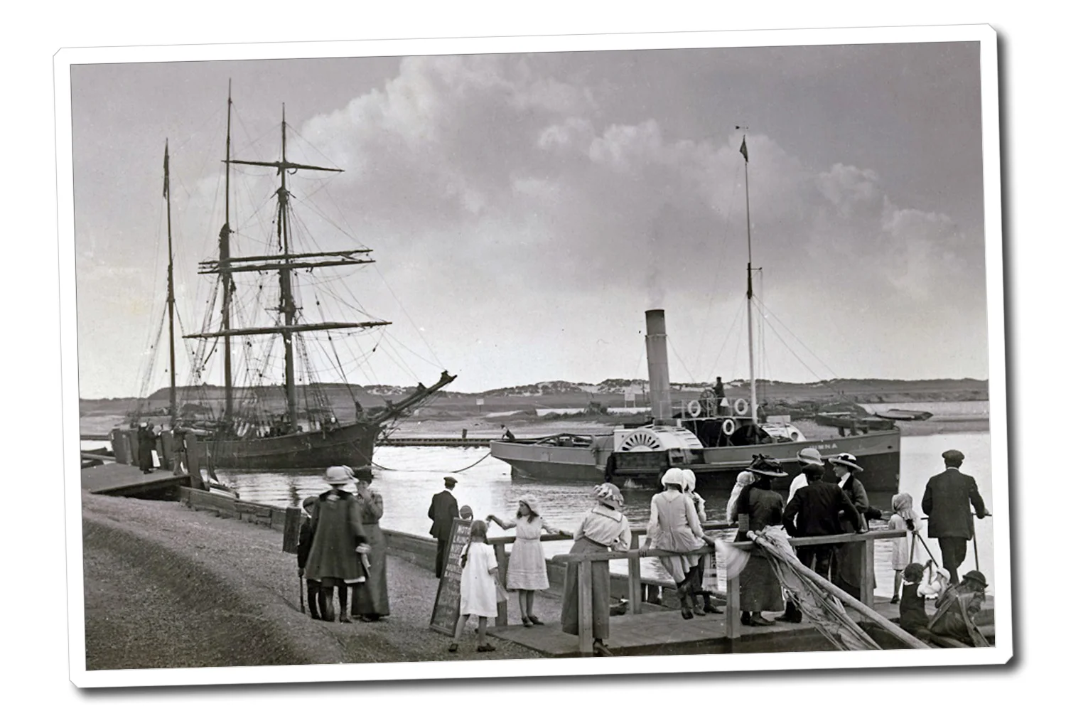 Here’s a postcard by William Wareham from about 1910 showing Jumna towing Sarah Amy into Littlehampton, with a group of passengers waiting for the trip boat Norfolk to the Black Rabbit Inn, just upstream from Arundel.