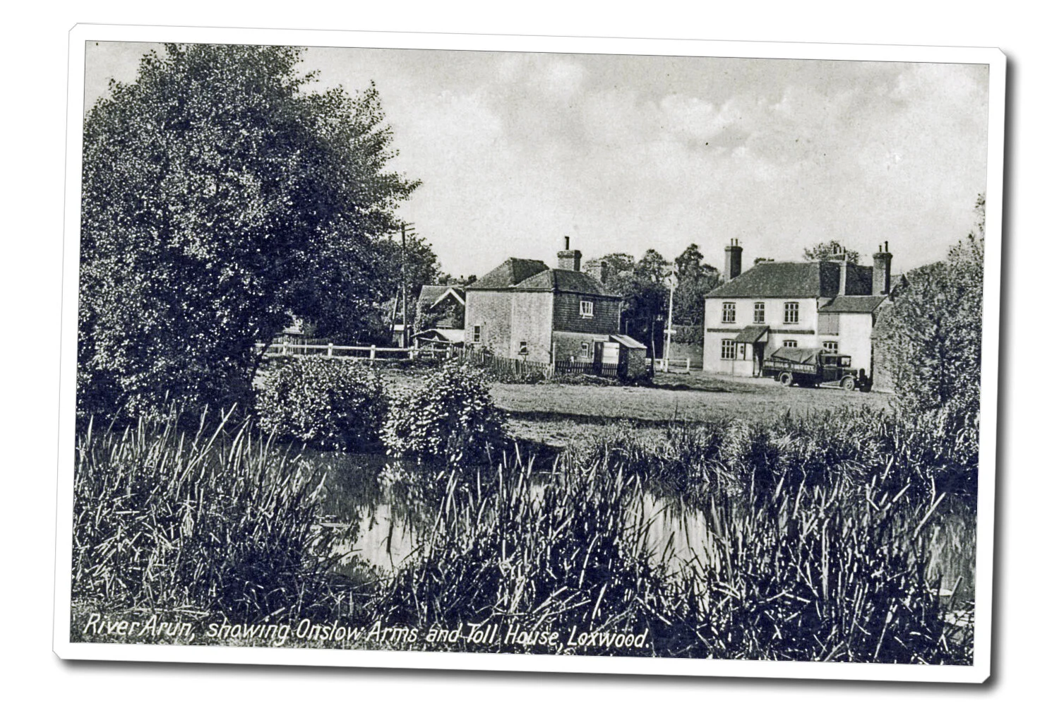 This unposted card, from the Regal Art Publishing Company, London, shows the Toll House (left) and the Onslow Arms with the River Lox in the foreground. The lorry in front of the pub looks to be a 1920s model, giving an indication of the postcard’s date.
