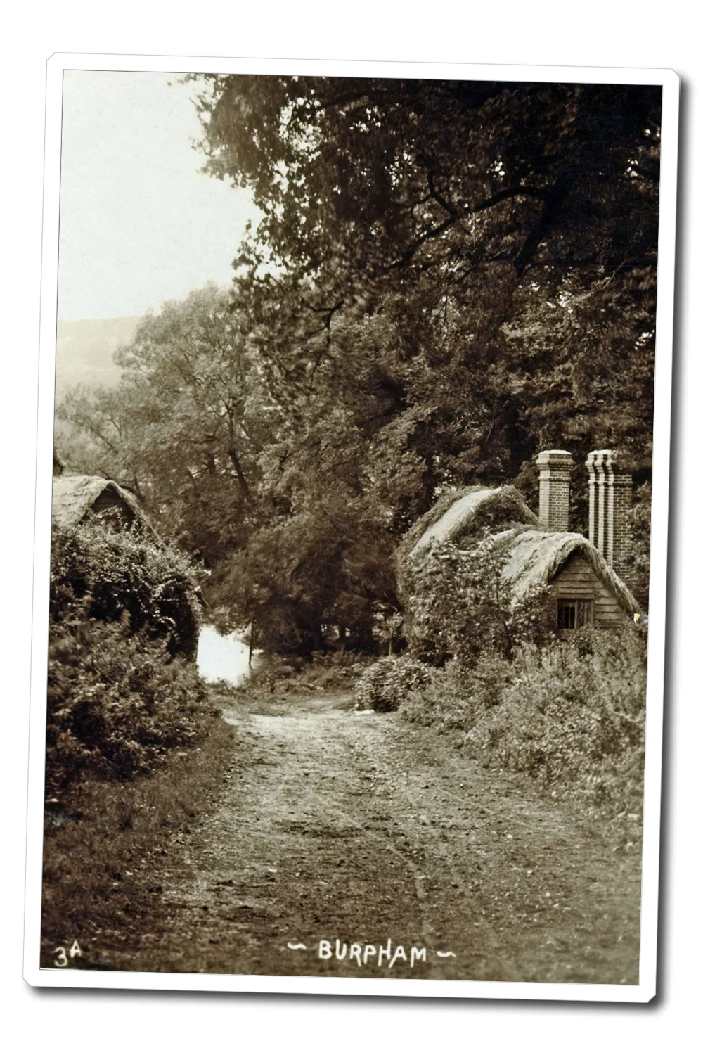 Here are two views of the lane leading to the river bank, labelled as Burpham but actually part of the nearby hamlet of Peppering. The portrait card shows the side of the Malthouse on the left. Opposite the Malthouse is Oliver's (later Tansy's) cottage which is featured, together with some rare film, in our Burpham video.