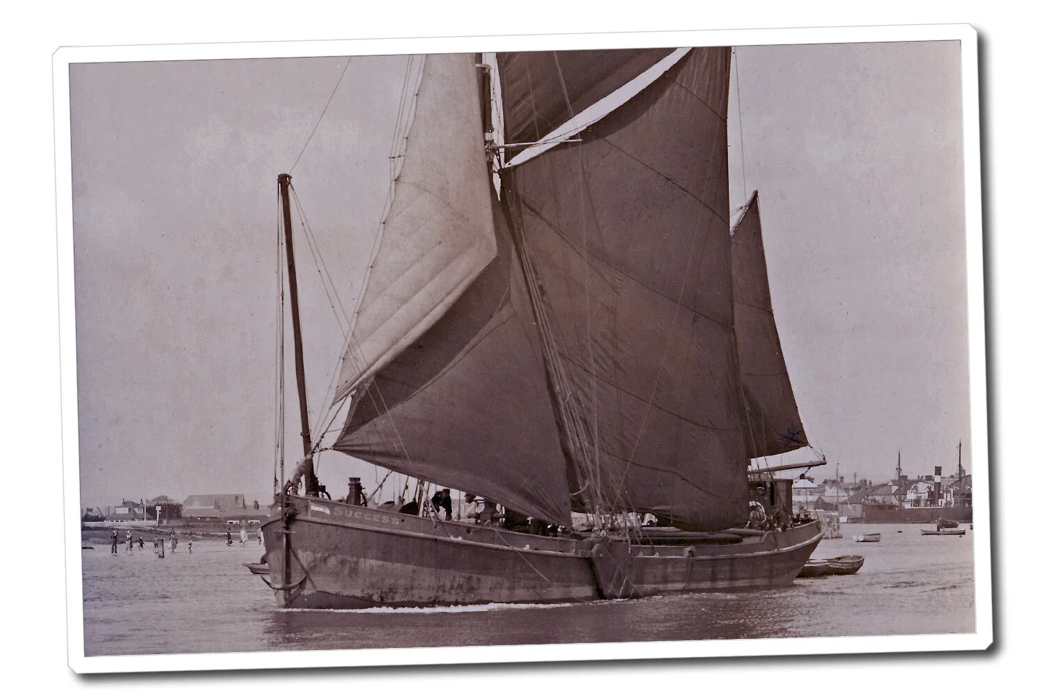 This is the Success departing Littlehampton under sail in a postcard by Frank Spry, probably from around 1930. The prominent vertical spar in the bow is her bowsprit which has been "steeved up" to enable closer manoeuvring in the confined waters if the harbour.